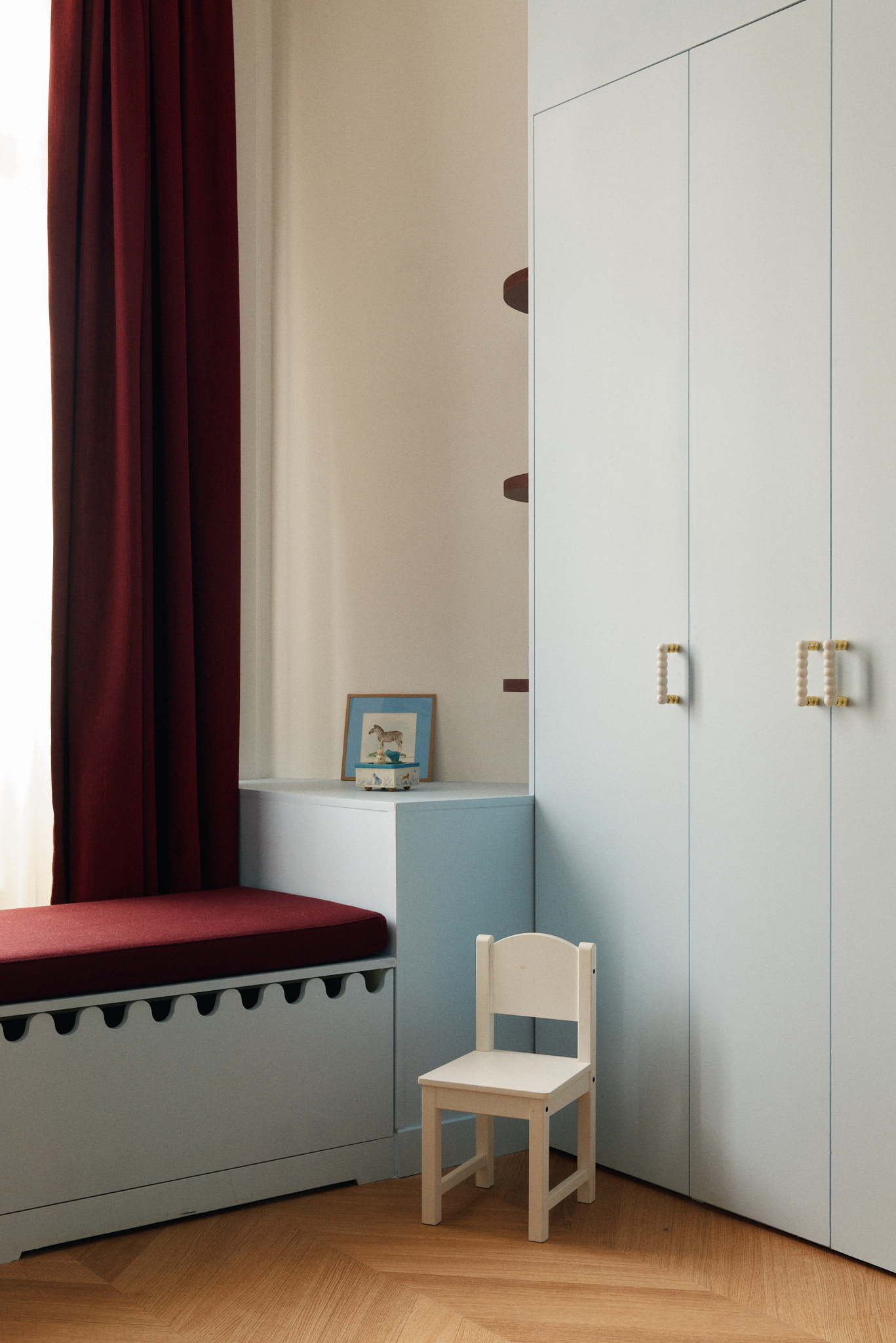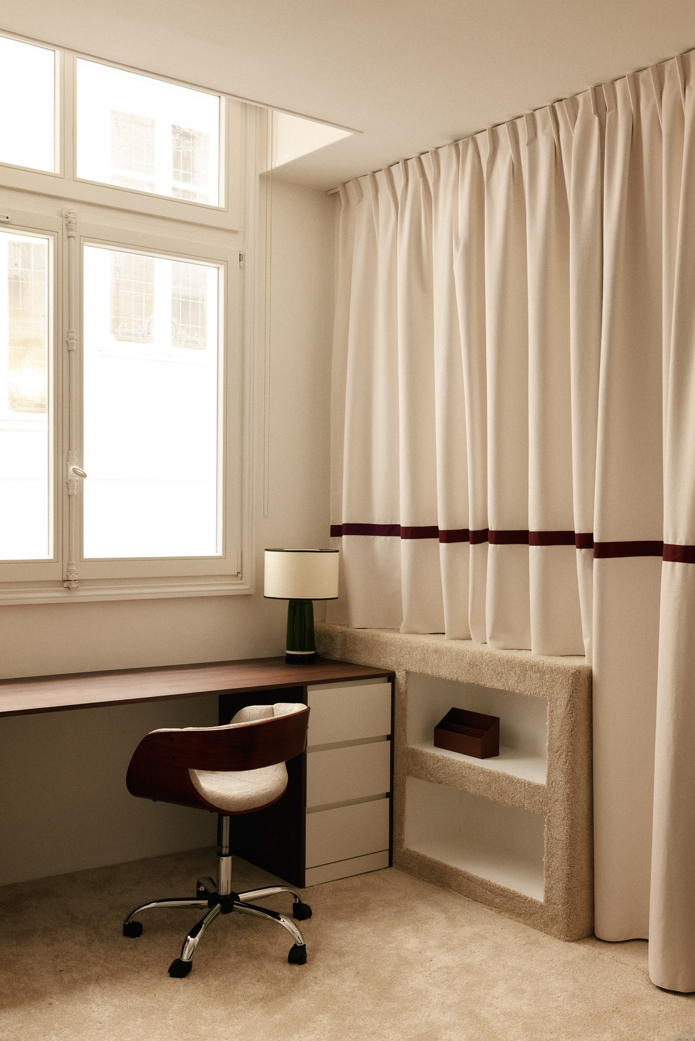 Le fil conducteur du projet s’appuie sur les vitraux existants de la cuisine, véritables éléments fondateurs de la palette chromatique. Les teintes bordeaux et vertes, issues de ces éléments, ont guidé les choix colorimétriques, créant une continuité subtile et une identité forte à travers les différents espaces. Élément phare du projet, l’oriel existant, orné de vitraux colorés, a été transformé en un véritable espace de vie, au cœur de l’appartement. Une banquette sur mesure y a été intégrée, épousant parfaitement ses courbes.